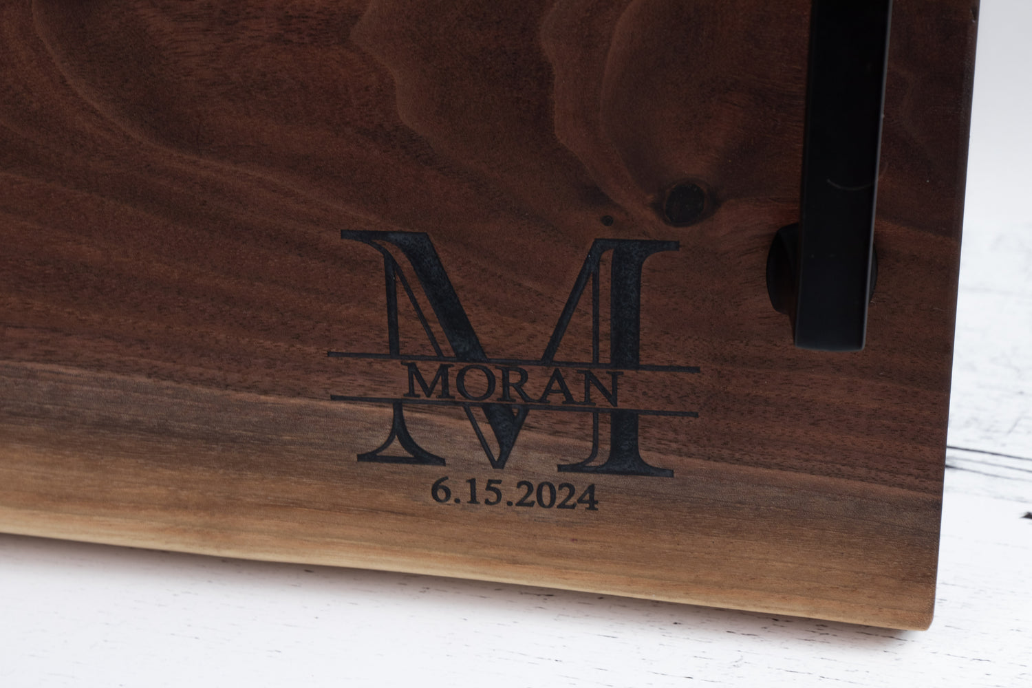 This custom walnut board was created to commemorate a meaningful milestone — the beginning of a shared life together. Featuring a small, understated monogram, the piece is engraved with the Moran family name and the wedding date 6.15.2024, allowing the personalization to feel elegant and timeless rather than bold or overpowering.